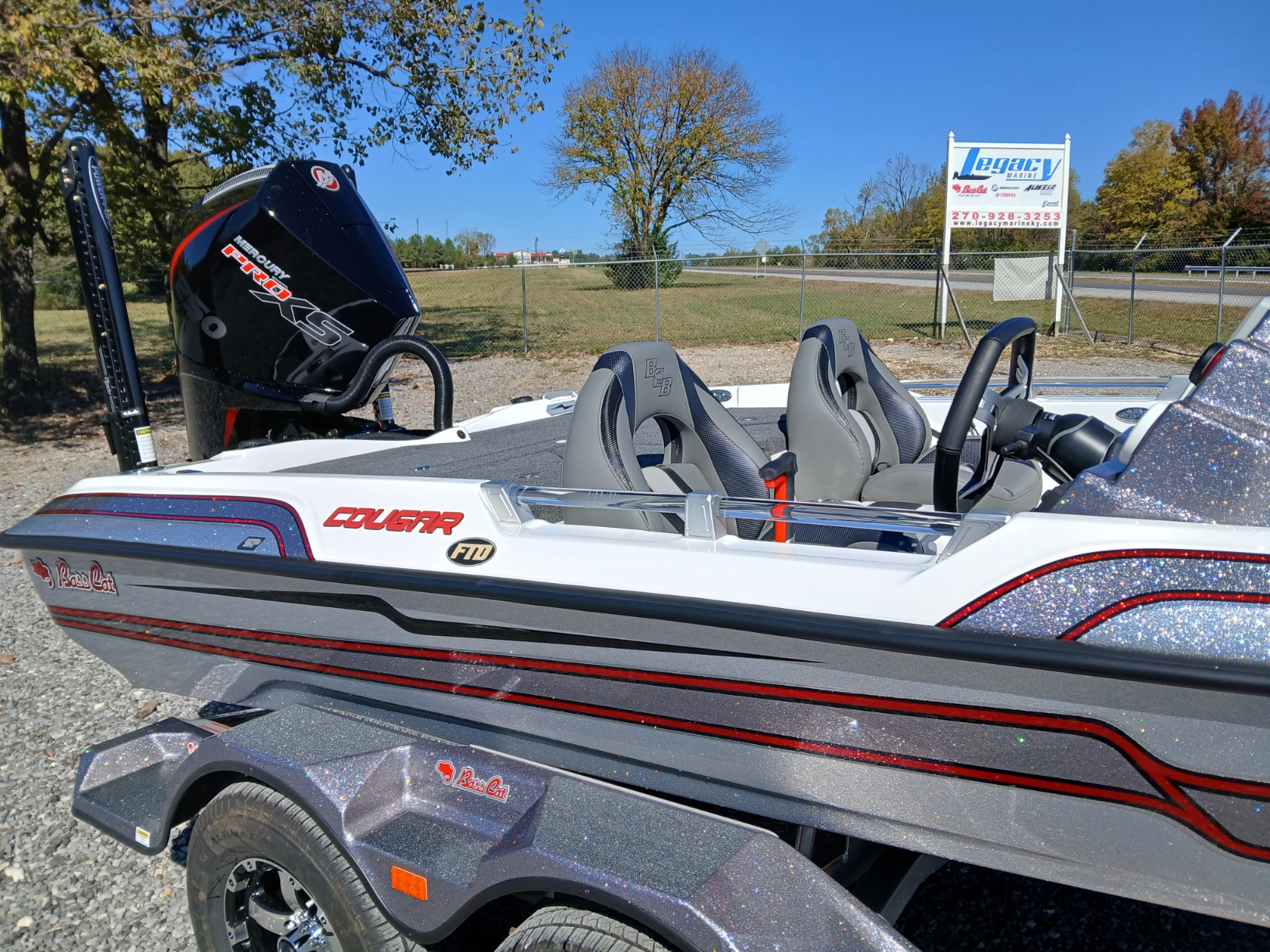 2025 Bass Cat Cougar FTD Show Special with a Mercury 250 ProXS TM V8 Fourstroke, This unit has all the show special features as shown on the Bass Cat website and is out fitted with a Garmin Trolling Motor and Garmin graphs. Plus we have outfitted with the following options to make it a flagship unit. These options are at our cost!!! XLT jack, trailer grab post and steps, rear transducer shield saver, Hamby bow protector, hot foot and slide, Bob's Hydraulic Jack Plate, Dual Pro Trim, wireless stop switches for the Power Poles, fiberglass step box, padded front deck.  Give Ray or Chris a call at 270 928 3253