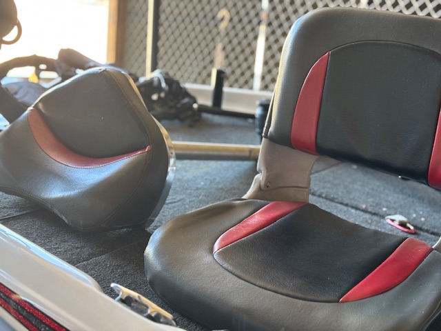 Good condition for 21 yo boat. Original seats and carpet, dual console. Garmin electronics including live scope.LVS32 transducer , 9 inch screen on console and 10 inch bow. Minn Kota 80 lb thrust, ultrex. With remote. Boarding ladder on stern and trailer steps on bow. Rebuilt power head August 23. Total hours on boat motor 453. Spare tempest prop 26p. Tandem axle trailer . Note pic driver side has deep scratch . Three seats two pedestals. Custom Bass Cat travel cover. Garage kept roughly 50 percent. Boat is at Lake Balboa Hot Springs Village. $18,000.00 479-719-8665. p