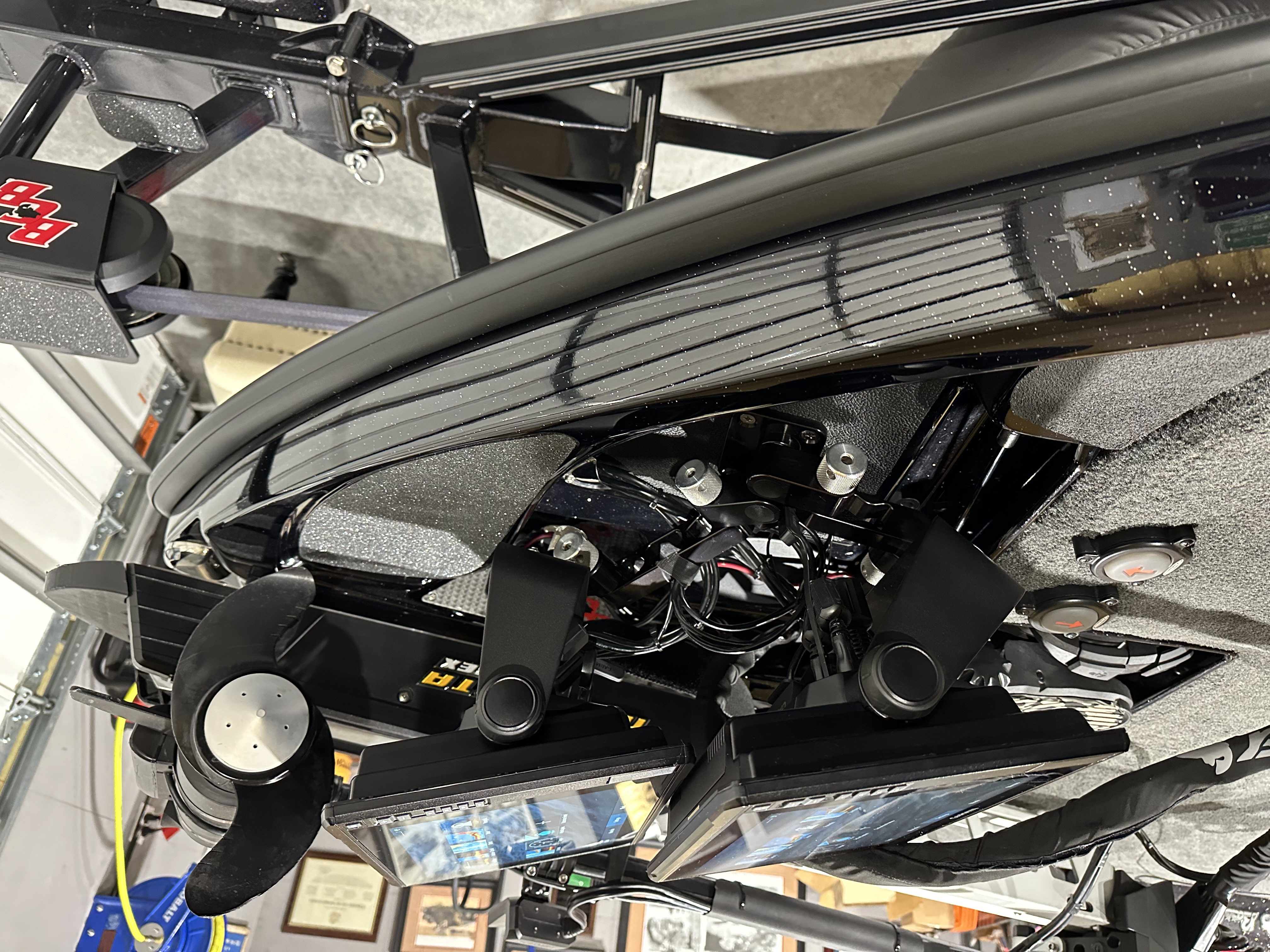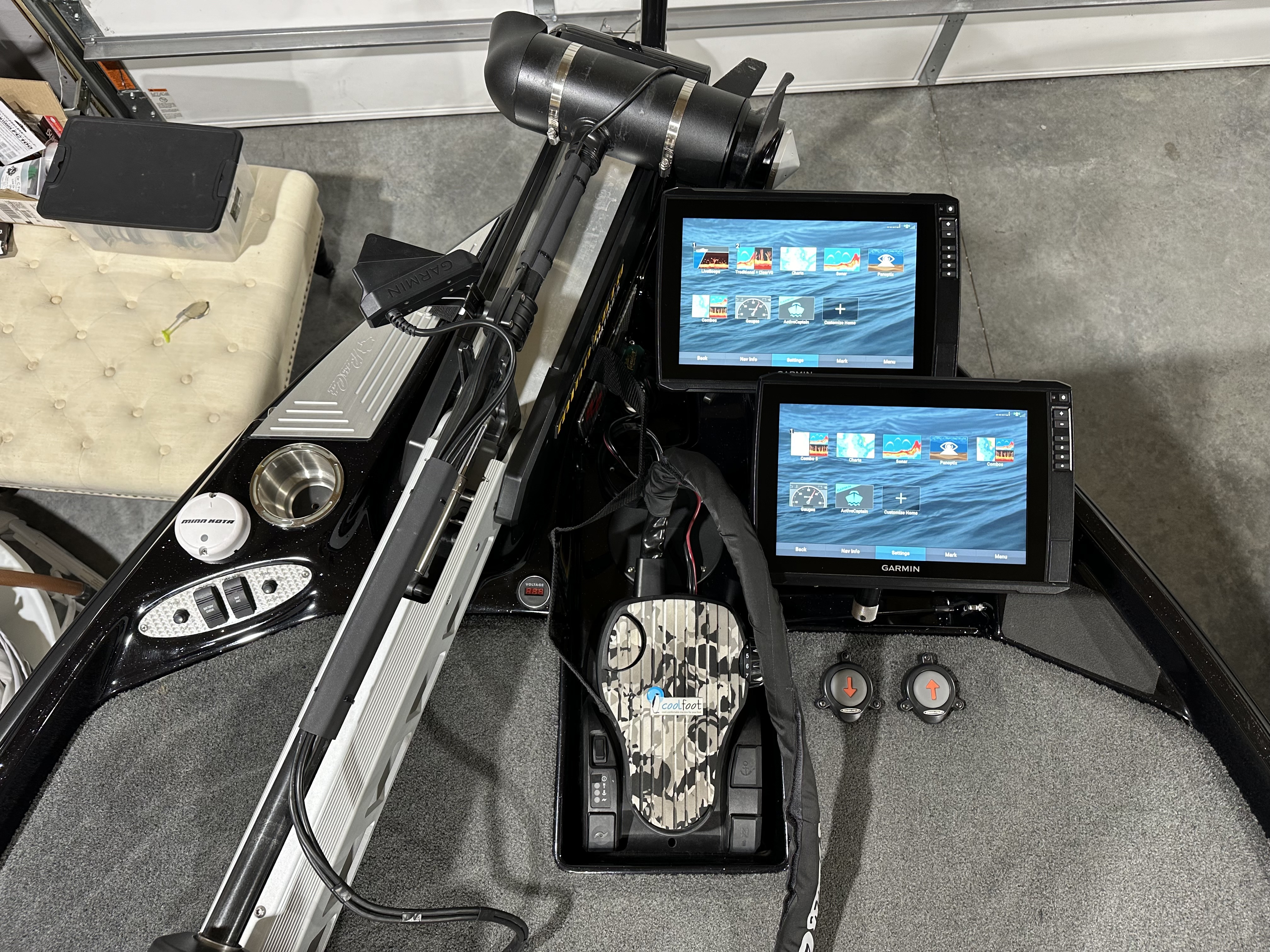 Bow electronics Garmin 126 + 122 with Gt56 on trolling motor with Brian customs cable management sleeve.