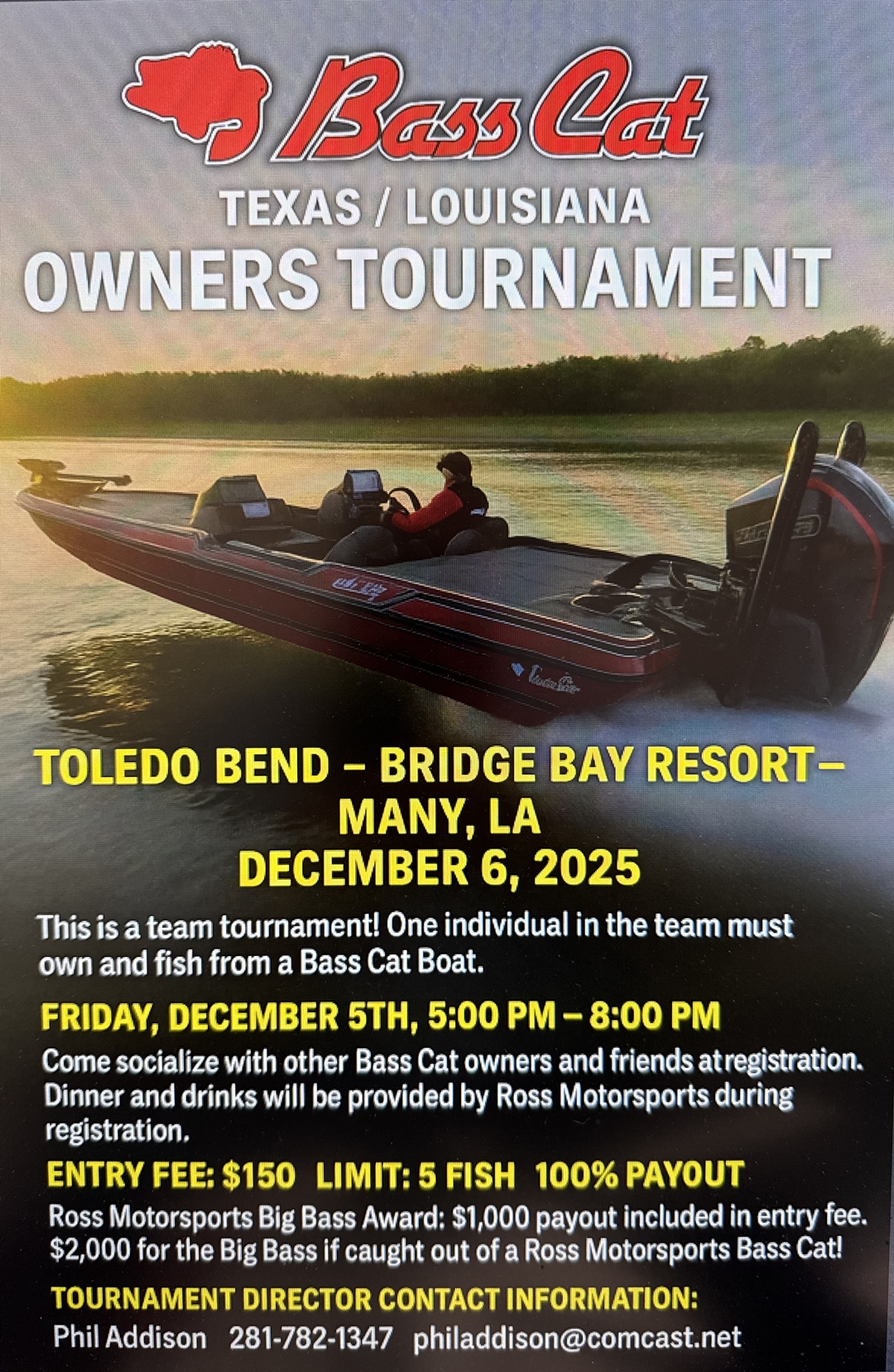 The annual Texas Louisiana Owners tourney (also know as the GAF) will be held at Toledo Bend on December 6th. We will be hosting the tournament out of Bridge Bay and will have a get together and registration there on Friday the 5th at the pavilion.